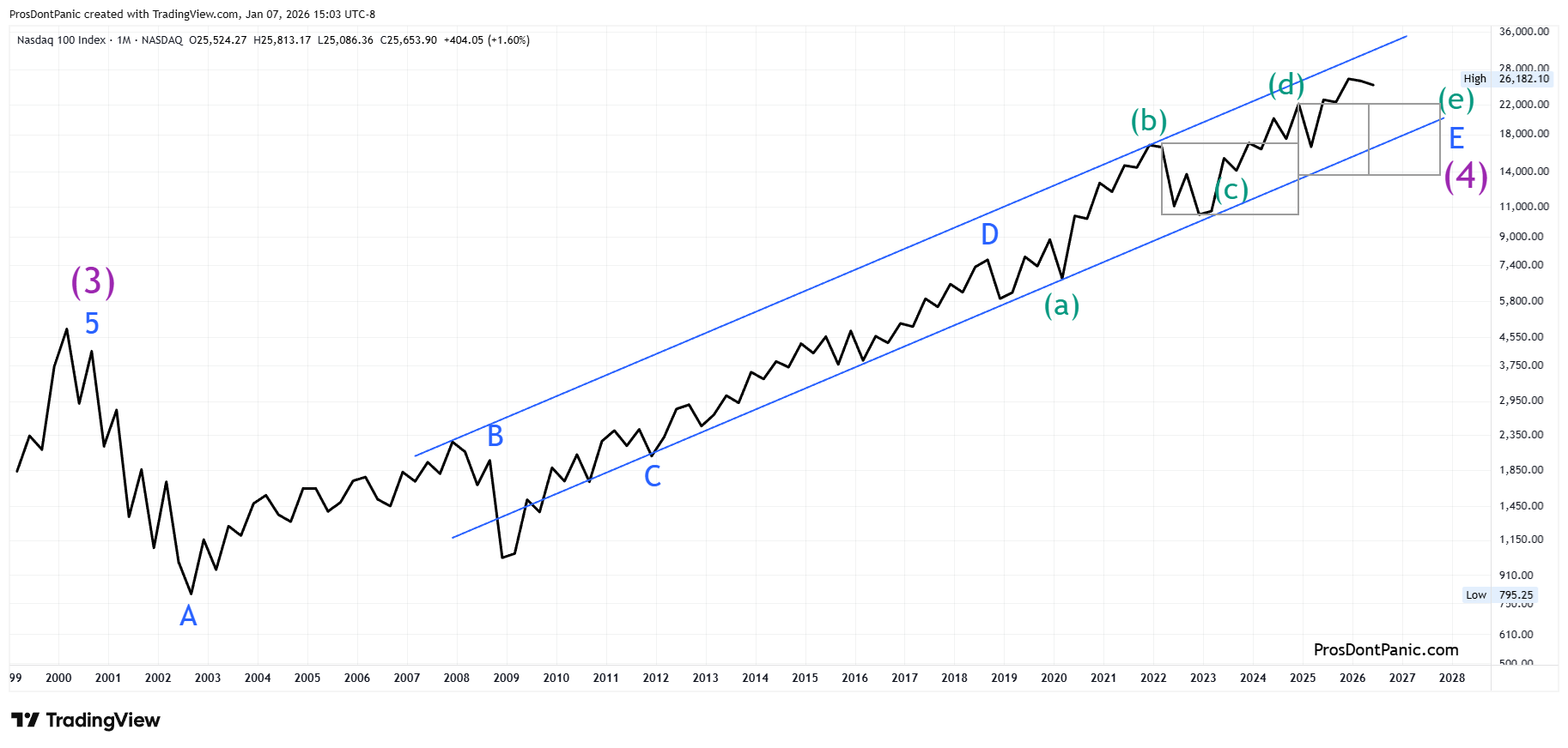 NDX is completing a 26-year running bear market correction. We need to get through the end of Wave-(4) which is completing wave-E then the real bull market will begin.